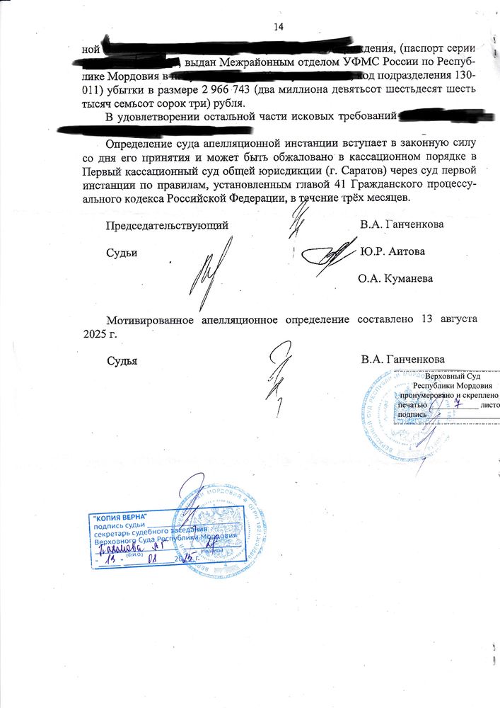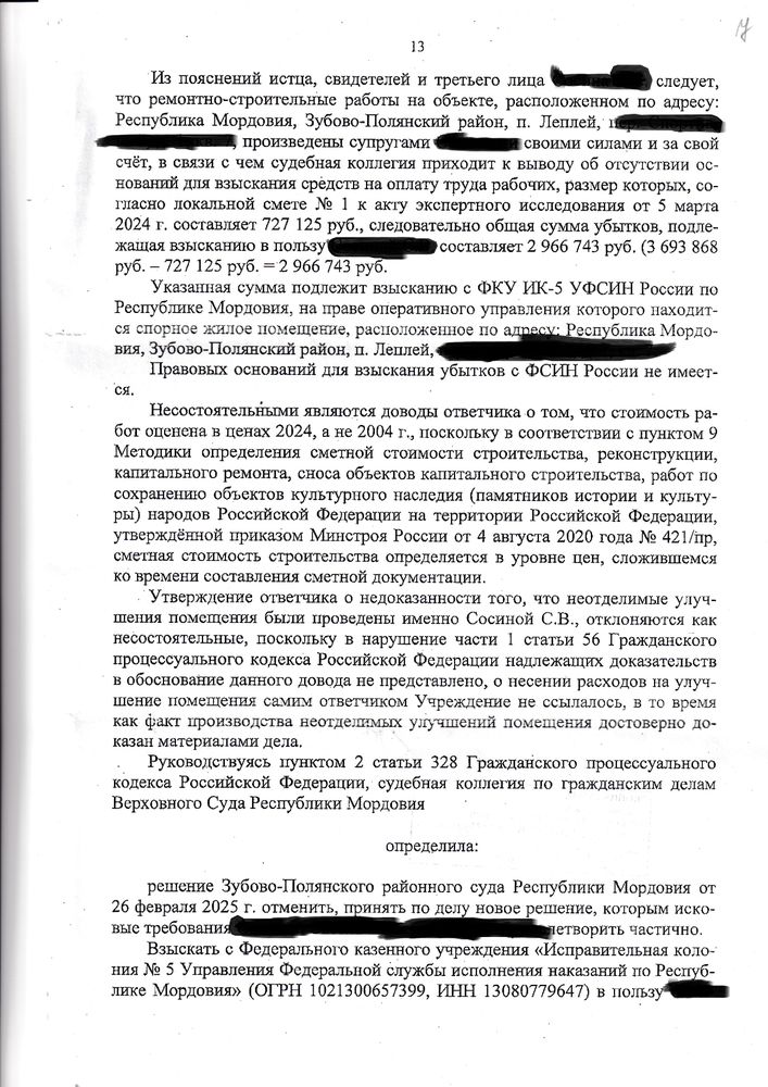 Верховный Суд Респ. Мордовия согласился с доводами моей апелляционной жалобы, отменил решение Зубово-Полянского р-го суда и взыскал с ФКУ ИК -5 УФСИН по РМ 2млн966743р руб